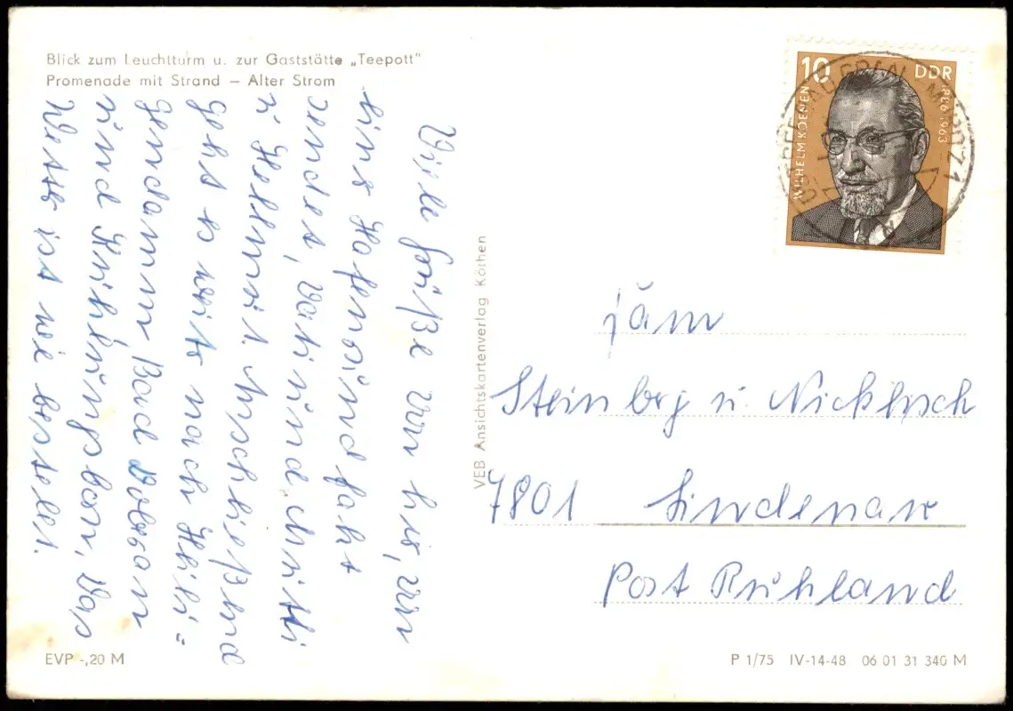 Name: DDR Mehrbildkarte Blick Leuchtturm Gaststätte „Teepott" Promenade mit Strand Alter Strom