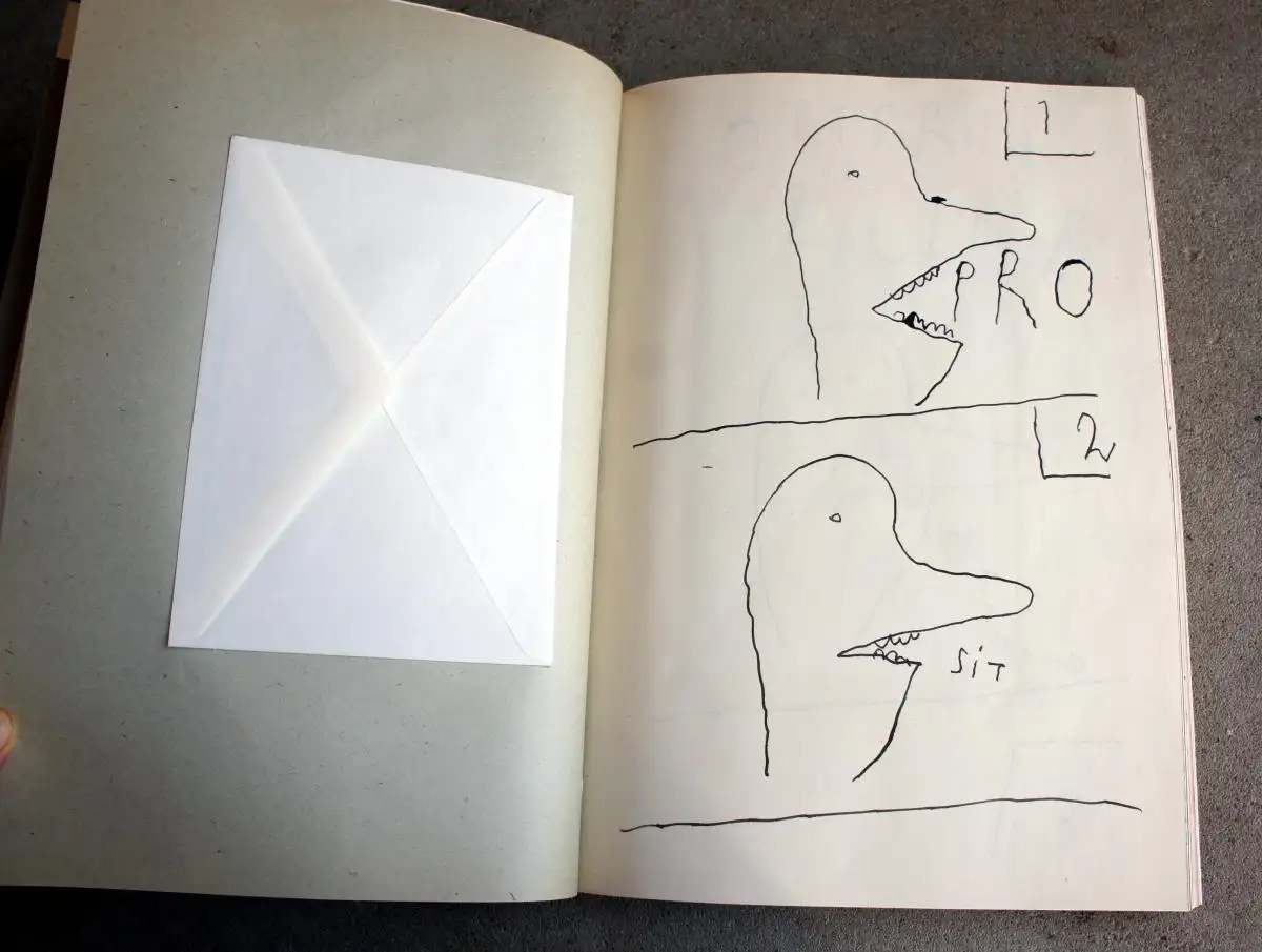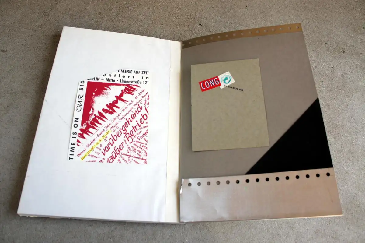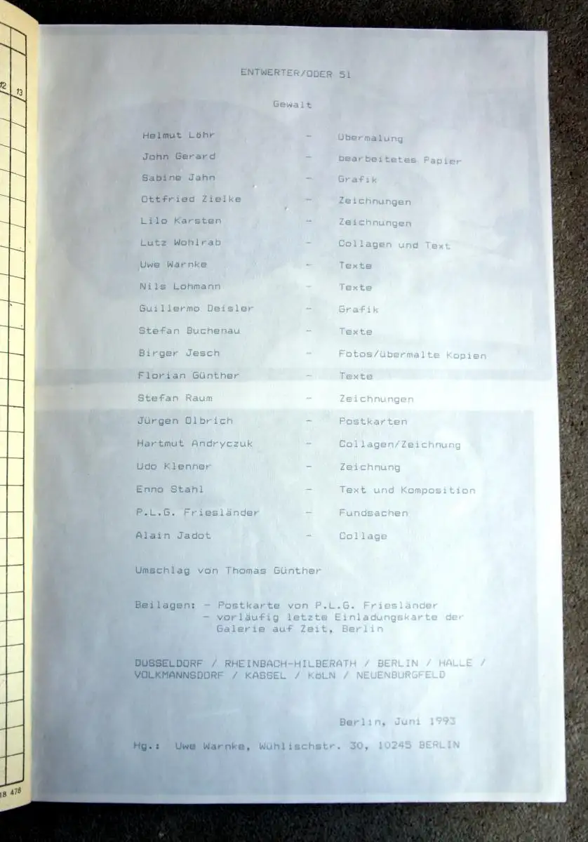 Originalgraphische Zeitschrift in einer Auflage von 30 Exemplaren mit Beiträgen von: Übermalung von 4 Fotoreproduktionen von Helmut Löhr, bearbeitetes Papier von John Gerard, Serigrafie und Text von Sabine Jahn, 3 Zeichnungen von Ottfried Zielke, 4 Zeichnungen auf Kopien von Lilo Karsten, 2 Collagen, 4 Kopien und Text von Lutz Wohlrab, 2 Texte und 3 Fundstücke von Uwe Warnke, 4 Texte von Nils Lohmann, Grafik von Guillermo Deisler, 3 Texte von Stefan Buchenau, 3 Fotos(Kopien, 2 übermalt) von Birger Jesch, 7 Gedichte von Florian Günther, 4 Zeichnungen von Stefan Raum, 8 Postkarten von Jürgen Olbrich, 3 Collagen und Zeichnung von Hartmut Andryczuk, Zeichnung von Udo Klenner, Text und Komposition von Enno Stahl, 4 Fundstücke von P.L.G. Friesländer, Collage von Alain Jadot.