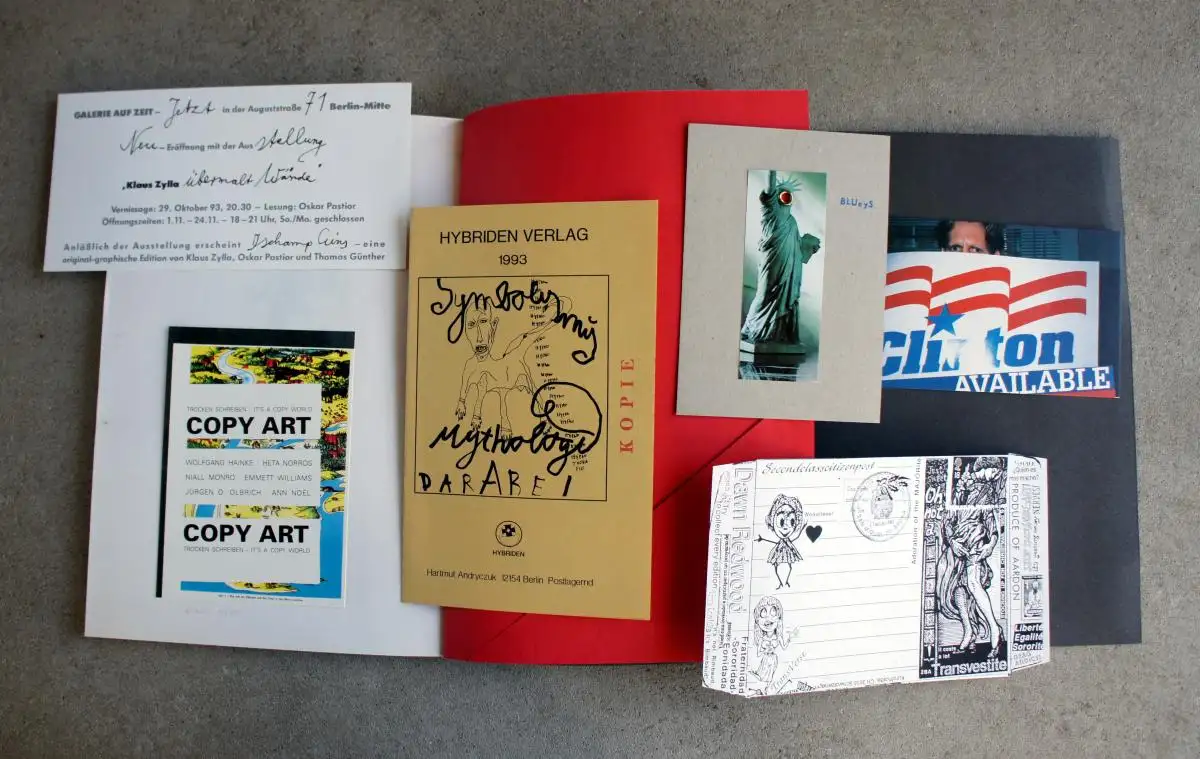 Beilagen von: Information des Hybriden Verlags, Einladungskarten von Jürgen Olbrich, Postkarte von P.L.G. Friesländer, Einladungskarte von Klaus Zylla, Mail-Art-Einladung.