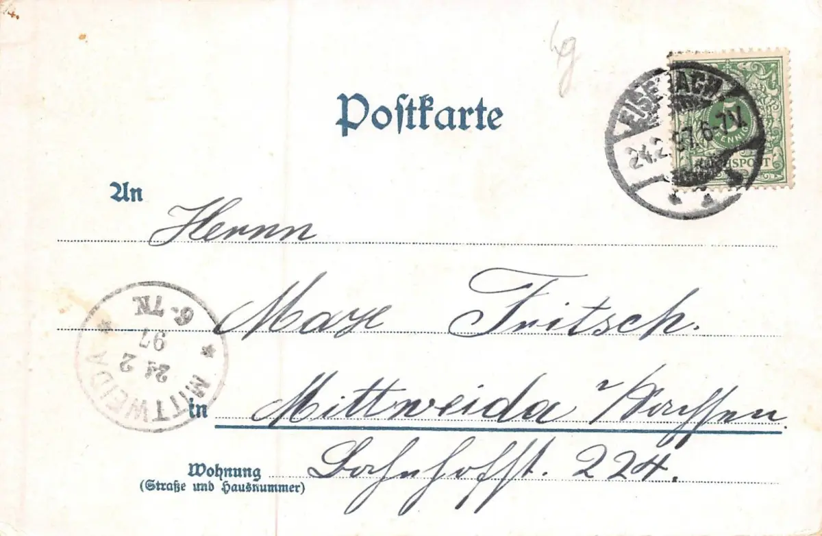 Rückseite: gelaufen 1897 von Eisenach nach Mittweida
