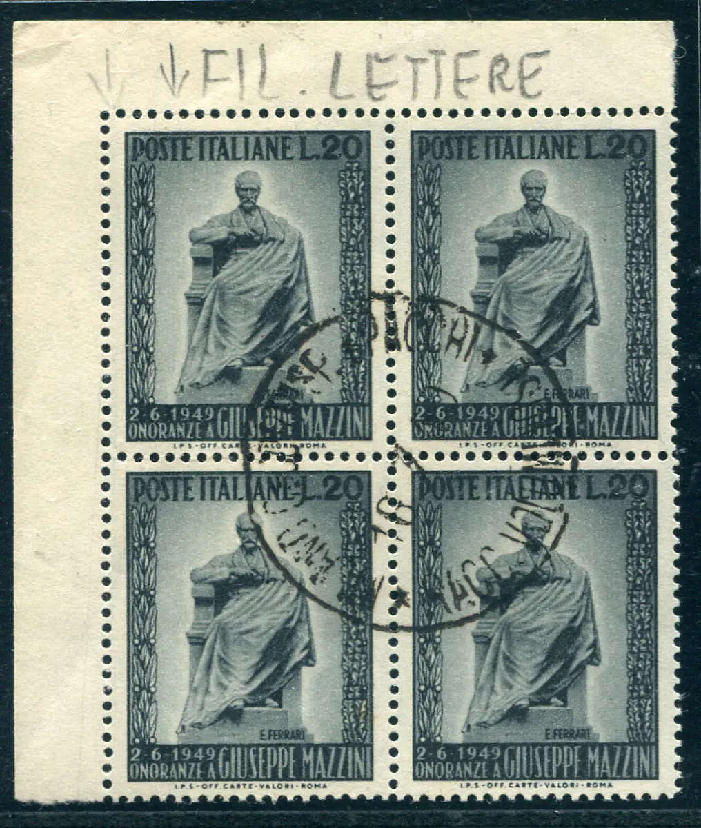 Wasserzeichen-Buchstaben-Blöcke 10/10 GEBRAUCHT - Mazzini Nr. 604 Viertel a. von f. mit zwei Exemplaren filigran Buchstaben 10/10 rechts - Uncommon Cod. 399/15