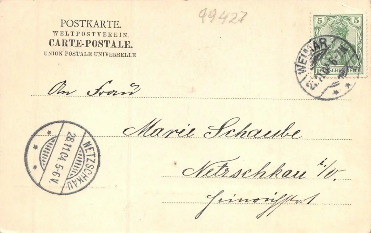 Rückseite: gelaufen 1904 von Weimar nach Netzschkau