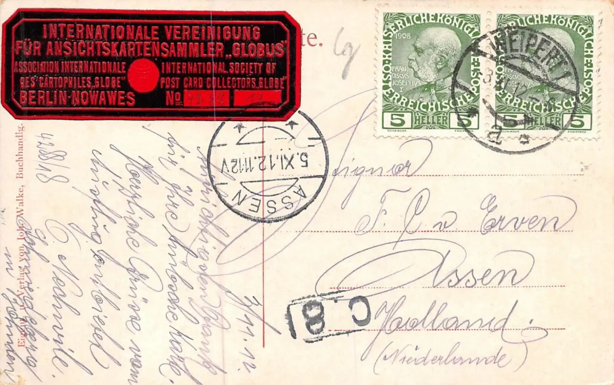 Rückseite: gelaufen 1912 von Weipert nach Assen