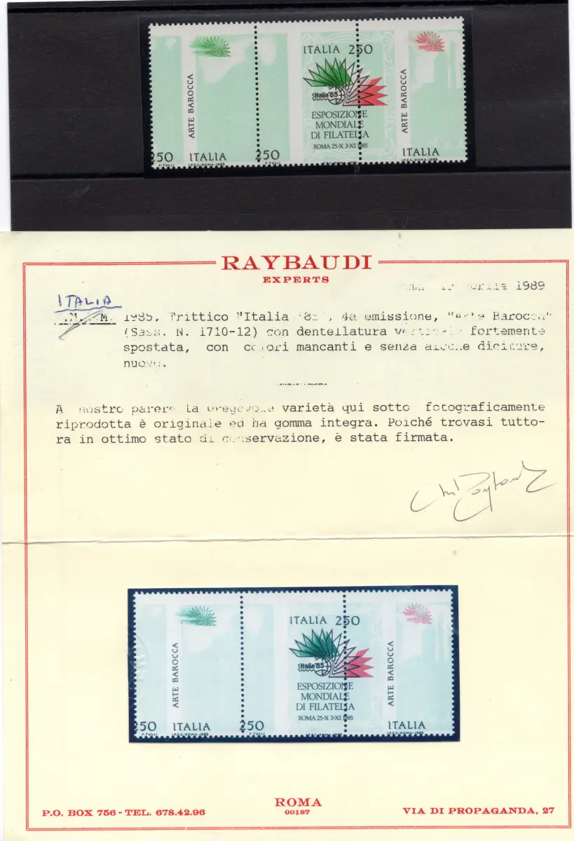 MNH - Vollgummi - Weltausstellung Philatelie Nr. 1710/1712 das Triptychon Barockkunst ohne Blaudruck mit stark verschobener vertikaler Verzahnung (Kat. Sass. spec. n. 1342Eb/1344Eb) - Rarität - Zert. Ray. oro Cod. 888/17