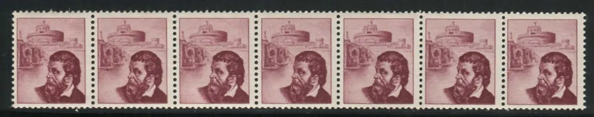 Benvenuto Cellini - Essig-Druckprobe Vollgummi - Benvenuto Cellini - Druckprobe des Polygraphiedrucks in Essigfarbe auf Papier ohne Wasserzeichen gedruckt, horizontaler Streifen von sieben Exemplaren aus Spule für Verteilmaschinen (Kat. Griffe Nr. 3) Code 480/7