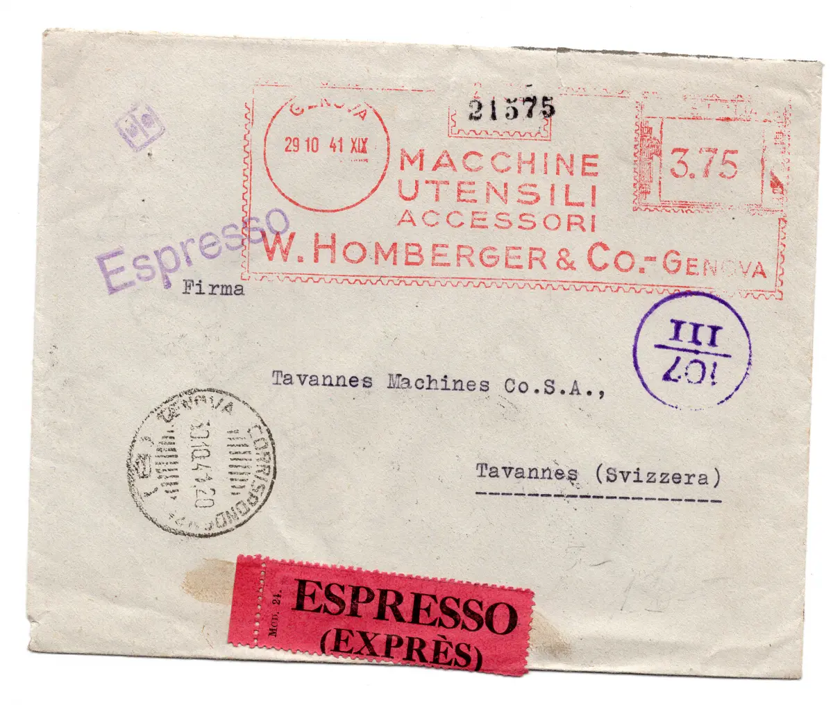 Umschlag - Espresso - Umschlag für die Schweiz am 29.10.41 mit roter mechanischer Frankatur für Lire 3,75 Werbeabdruck Werkzeugmaschinen Homberger - Genua seitlich Etikett Espresso Mod. 24 - hinten Ann. von Transit, Ankunft und Zensur - Schön und n