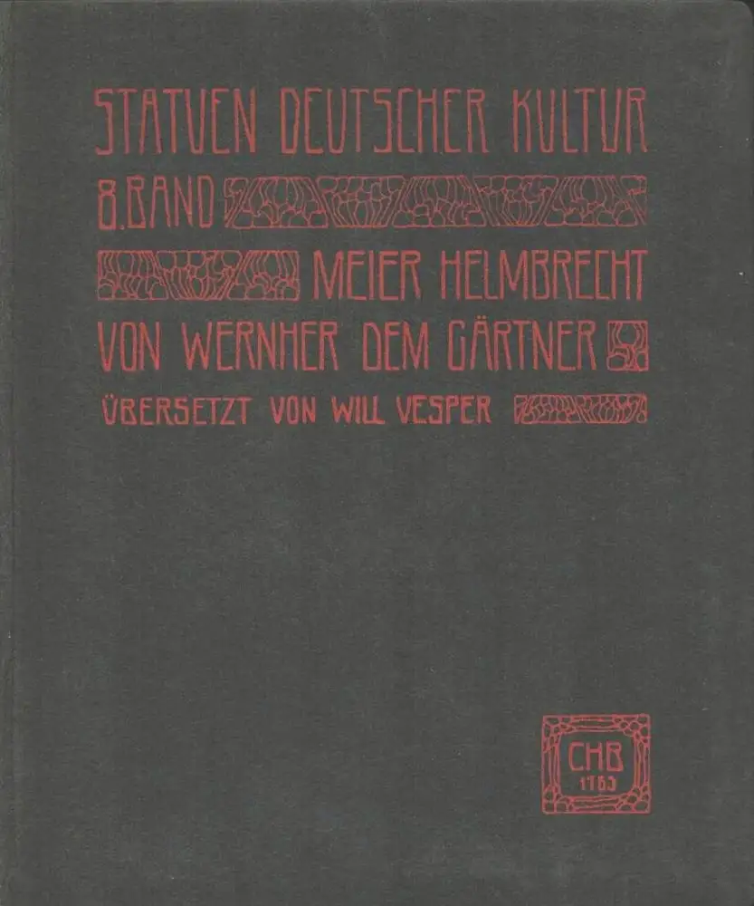 Versnovelle von der fragwürdigen Karriere des Bauernsohnes Helmbrecht als Raubritter, der sein sündhaftes Leben schließlich mit einem schrecklichen Ende bezahlt. - Werner der Gärtner, auch Wernher der Gartenaere (2. Hälfte 13. Jh.) war ein Dichter aus dem bairisch-austrischen Raum. - Will Vesper (1882-1962), Bauernsohn wie Helmbrecht, war ein deutscher Schriftsteller, Literaturkritiker und - später -Nationalsozialist. -Buchblock leicht schief; stellenweise mäßig stockfleckig