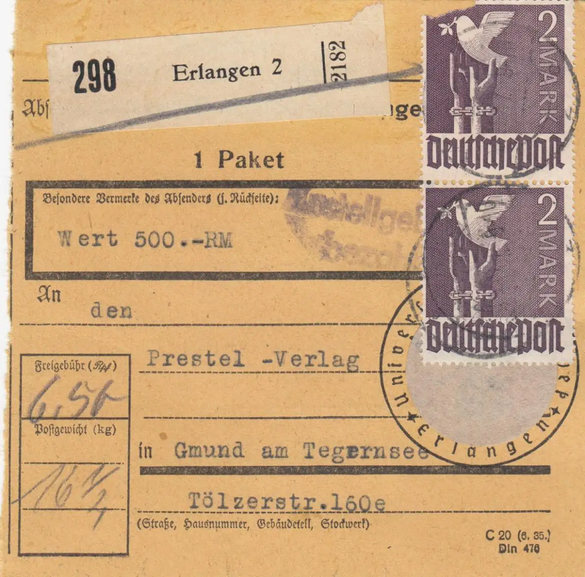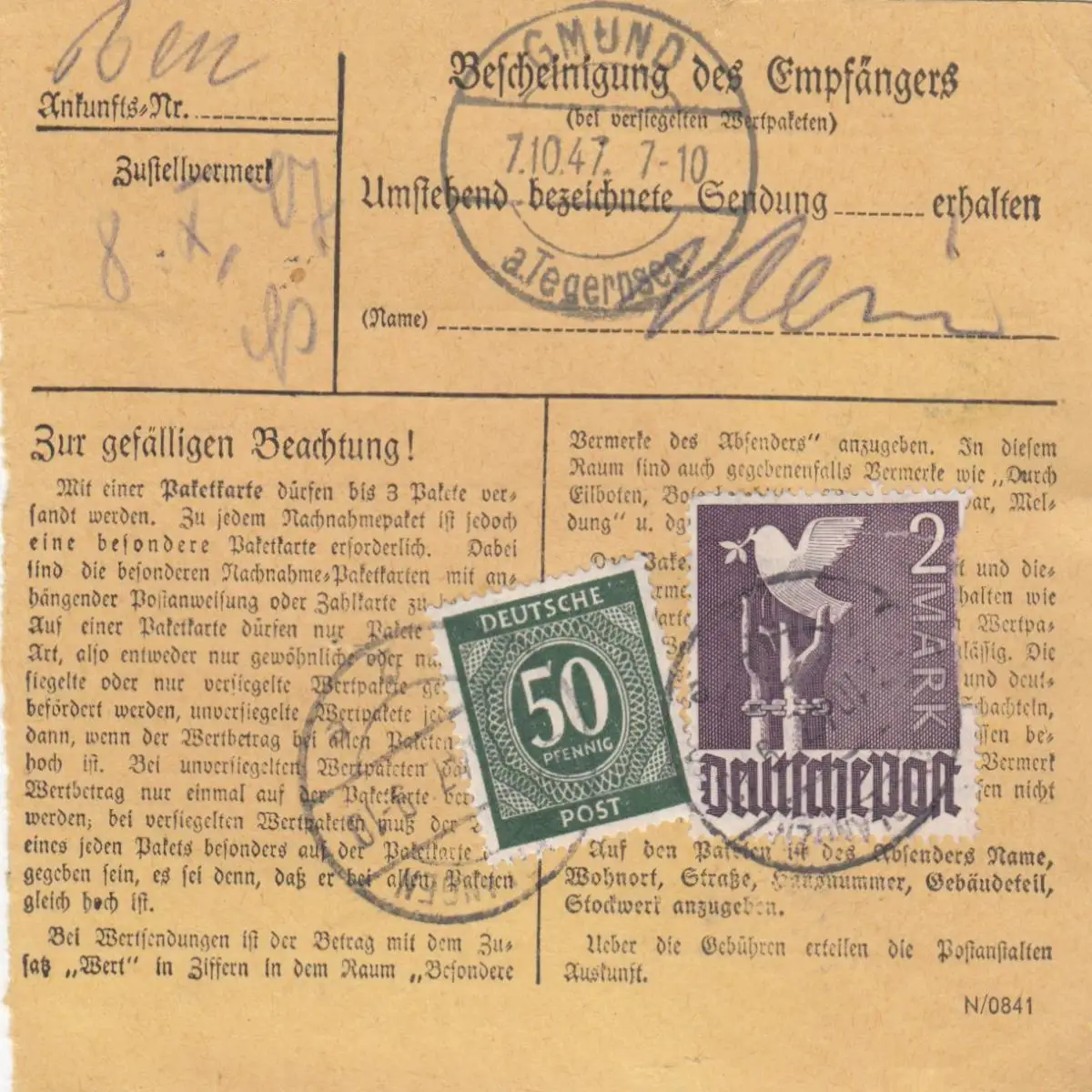 Wert-Paketkarte 1947: Erlangen nach Gmund, Dienststellenstempel III. Reich