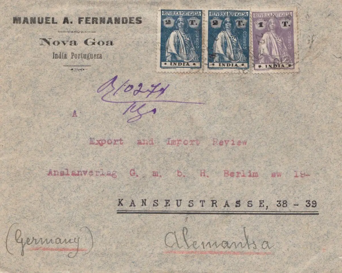 West India: 1922 Nova Goa to Berlin, Zug als Einschreiben eingegangen