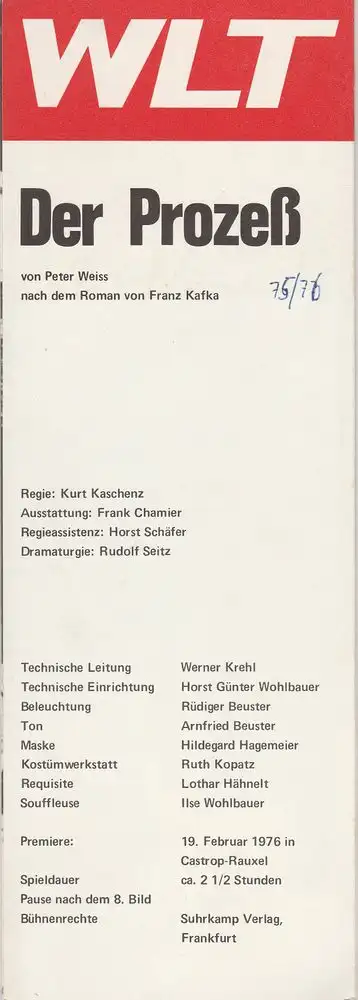Titel: Programmheft Franz Kafka DER PROZESS Premiere 19. Februar 1976 Castrop-Rauxel Spielzeit 1975 / 76
