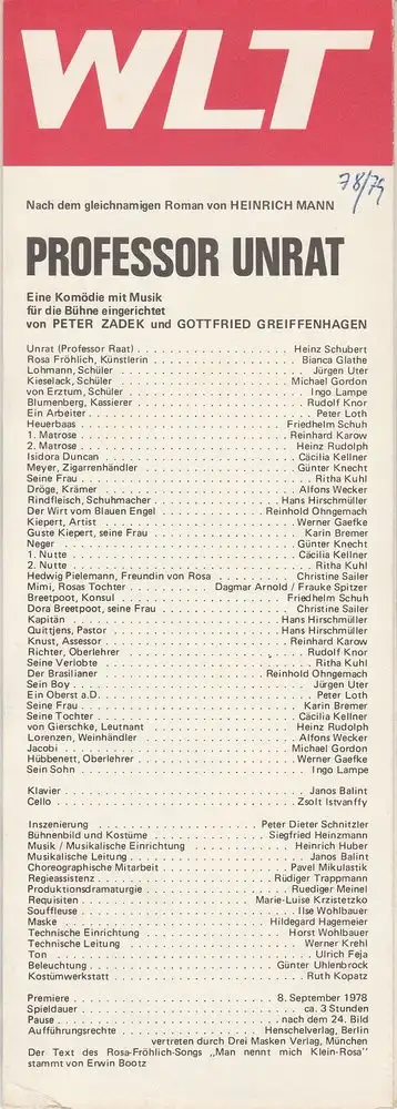 Westfälisches Landestheater WLT, Frieder Weber, Ernst Franz, Ruediger Meinl: Programmheft Heinrich Mann PROFESSOR UNRAT Premiere 8. September 1978.