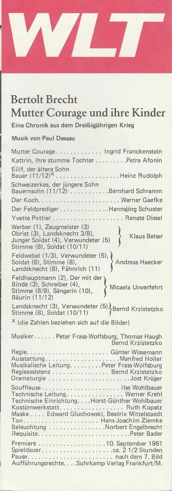 Eine Chronik aus dem Dreißigjährigen Krieg. Musik: Paul Dessau. Regie: Günter Wissemann. Ausstattung: Manfred Holler. Musikalische Leitung: Peter Frass-Wolfsburg. Mitwirkende: Ingrid Franckenstein, Petra Afonin, Heinz Rudoph, Bernhard Schramm, Werner Gaefke, Hannsjörg Schuster, Renate Dissel, u.a - Schlüsselwörter: Theaterprogramm, Opernprogramm, Ballettprogramm, Musicalprogramm, Konzertprogramm, Theatermemorabilia, Programmhefte Sammlung, deutsche Theatergeschichte.