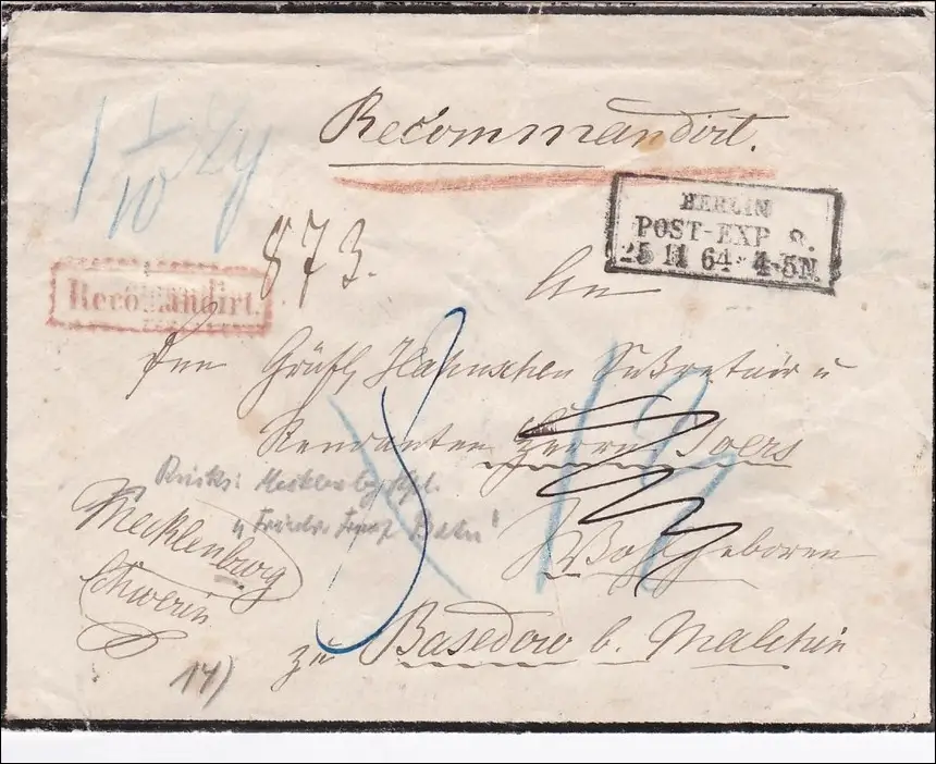 Der Brief als Einschreiben ist gerichtet an "den Gräfl. Hahnschen Sektretair Herrn Jaers Wohlgeboren zu Basedow bei Malchin". Einen Sekretär mit Post- und Einschreibgebühren zu belasten, wäre auch früher eine absolute Frechheit gewesen. Es dürfte sich um eine wichtige Verwaltungsangelegenheit gehandelt haben, für die der Sekretär im Auftrage einer anderen Person verantwortlich war, hier die gräfliche Hahnsche Verwaltung.