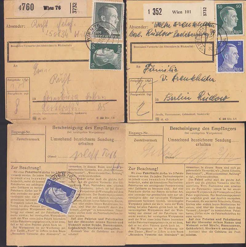 Wien 76, 101 zwei Paketkarten mit Hitlerfrankatur, dabei Feldpostabsender