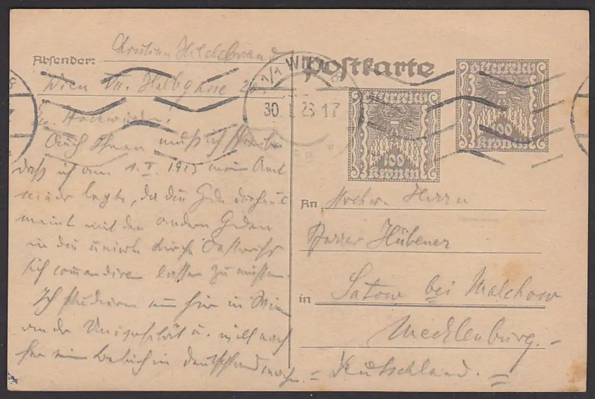 Wien GA mit 2 Wertstempel zu je 100 Groschen 1923 nach Satow bei Malchow Mecklenburg