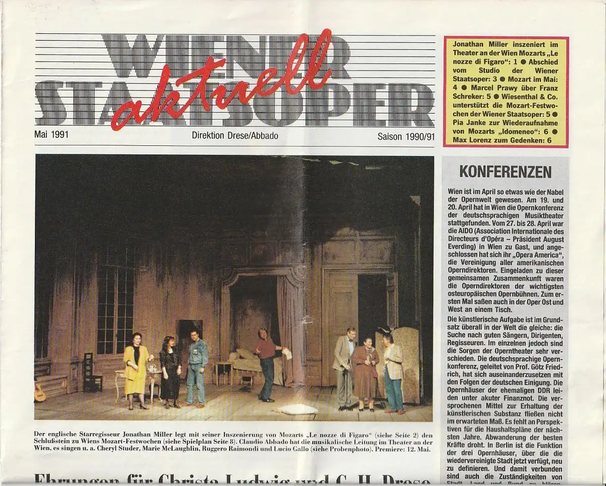 Jonathan Miller inzeniert im Theater an der Wien Mozarts Le nozze di Figaro / Aschied vom Studio der Wiener Staatsoper / Mozart im Mai / Marcel Prawy über Franz Schreker / Wiesenthal & Co. Unterstützt die Mozart-Festwochen der Wiener Staatsoper / Pia Janke zur Wiederaufnahme von Mozarts Idomeneo / Max Lorenz zum Gedenken - Theaterprogramm, Opernprogramm, Ballettprogramm, Musicalprogramm, Konzertprogramm, Theatermemorabilia, Programmhefte Sammlung, deutsche Theatergeschichte.