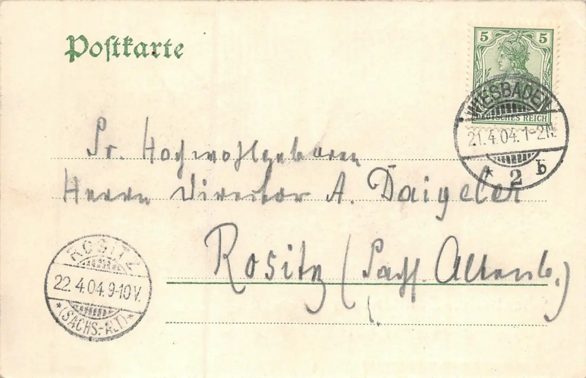 Rückseite: gelaufen 1904 von Wiesbaden nach Rositz
