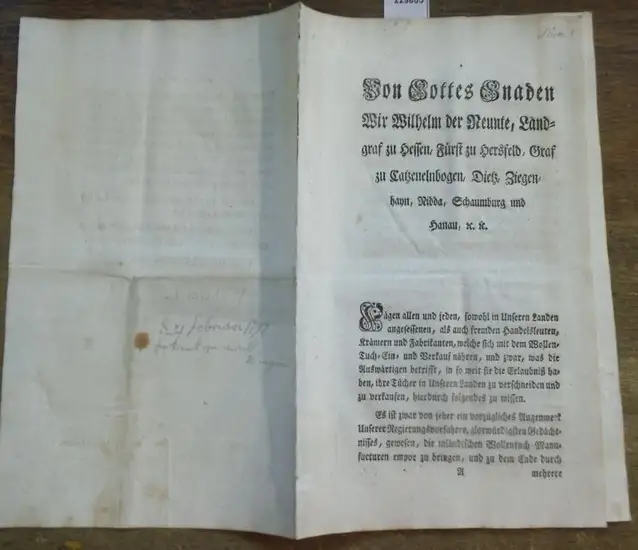 Wilhelm der Neunte. - Wilhelm IX, Von Gottes Gnaden, Wir Wilhelm der Neunte, Landgraf zu Hessen, Fürst zu Hersfeld, Graf zu Catzenelnbogen, Dietz, Ziegenhayn, Nidda, Schaumburg und Hanau u. u. Fügen allen und jeden, sowohl in unseren Landen angesessenen,
