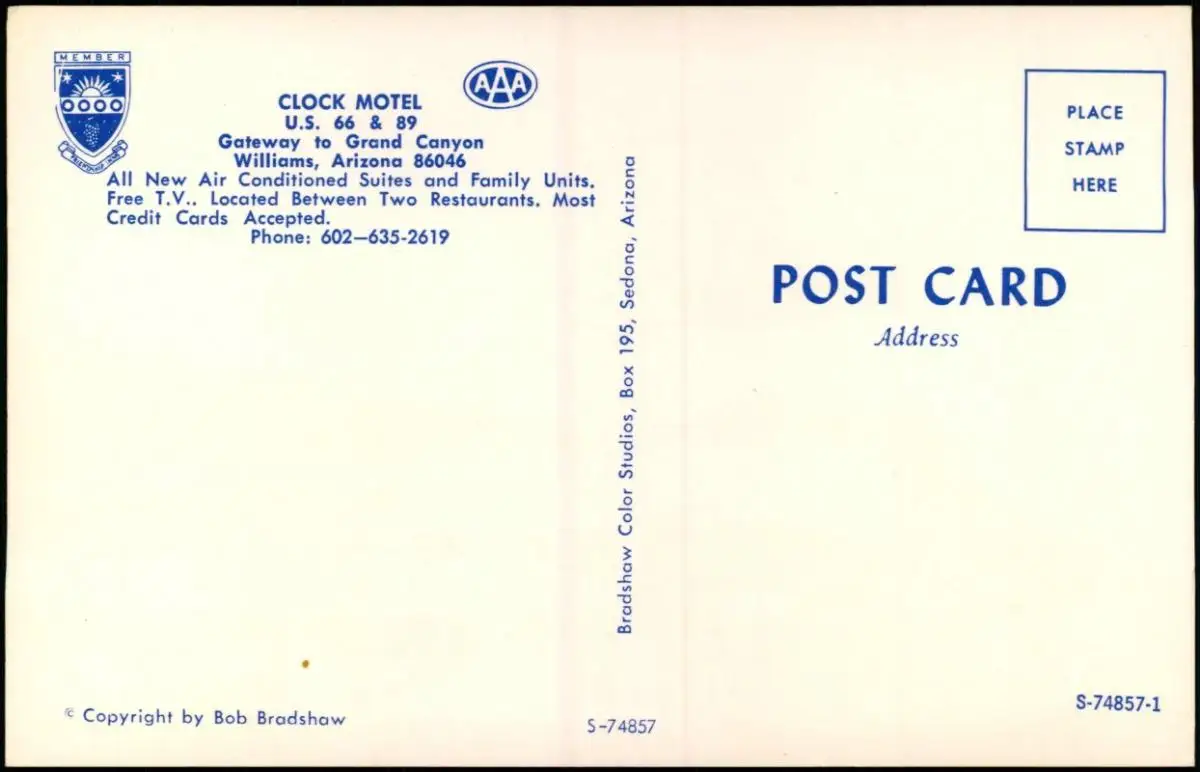 Williams (Arizona) CLOCK MOTEL U.S. 66 & 89 Gateway to Grand Canyon 1960