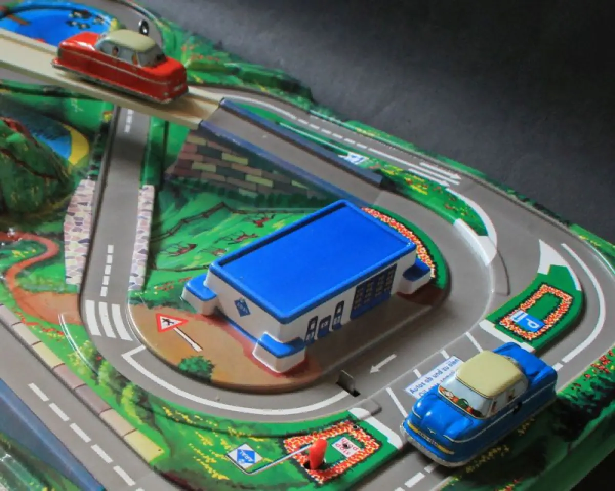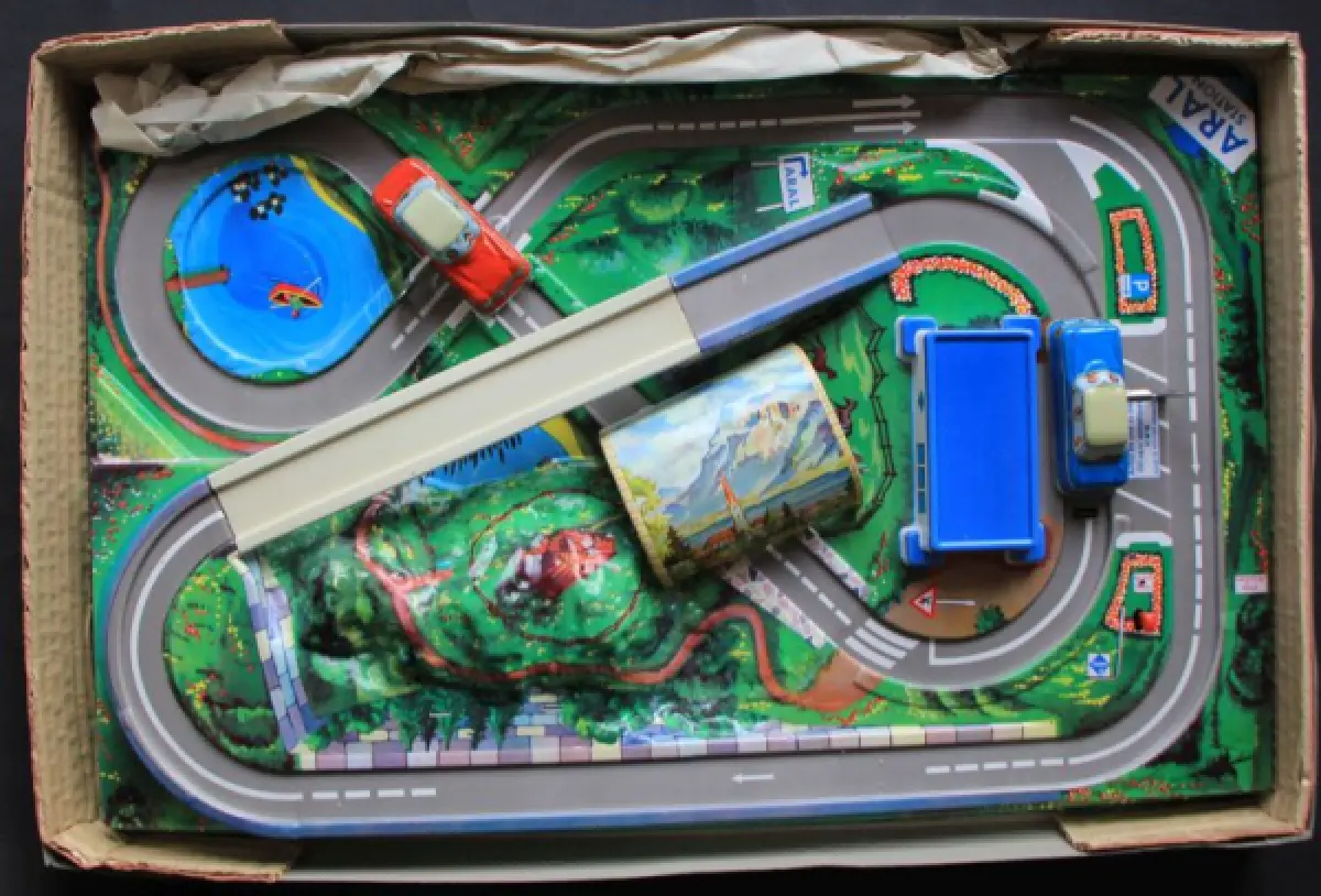 Wimmer "Hi-Way Motorway Excursion" 1963 Verkehrsbahn mit BV-Aral Tankstelle und zwei Fahrzeugen in Originalkarton (10662)