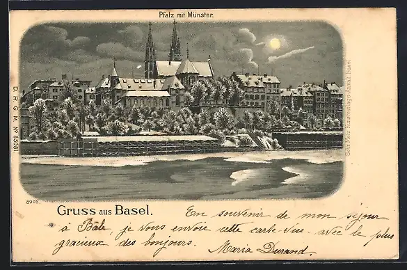 Winter-Lithographie Basel, Pfalz mit Münster im Schnee