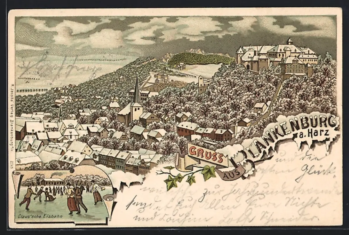 Winter-Lithographie Blankenburg a. Harz, Ortsansicht im Schnee und Claus`sche Eisbahn
