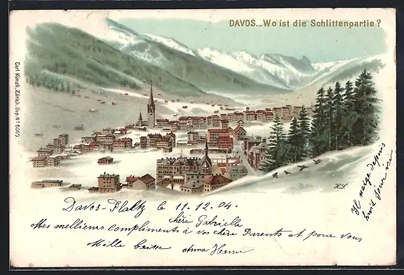 Winter-Lithographie Davos, Wo ist die Schlittenpartie, Bilderrätsel, opt. Täuschung