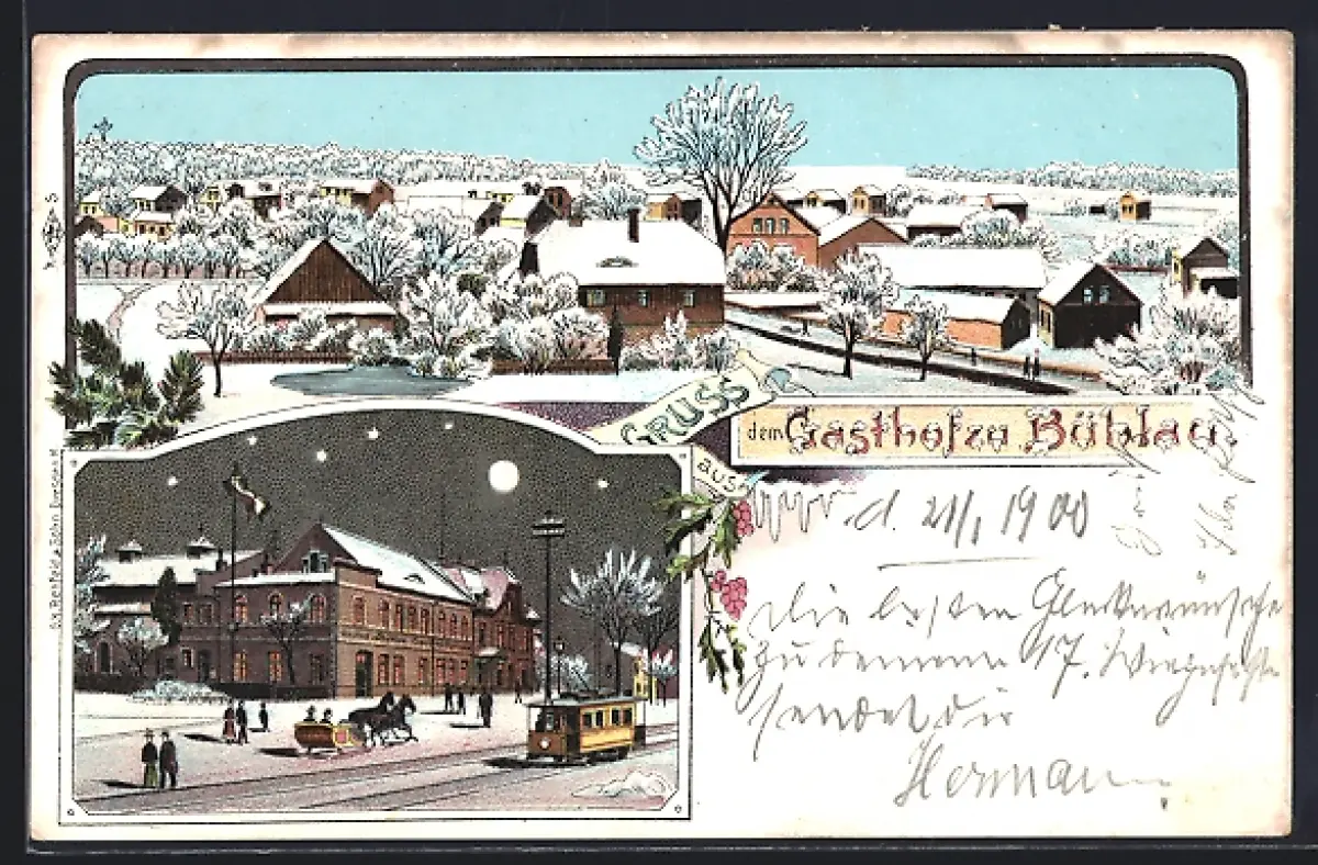 Winter-Lithographie Dresden-Bühlau, Gasthof, Strassenbahn, Ortsansicht