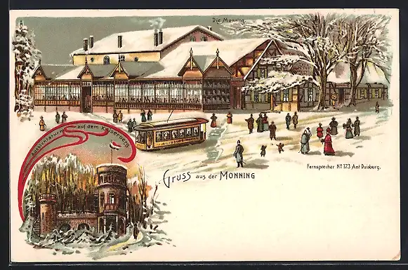 Winter-Lithographie Duisburg, Gasthaus Monning im Winter, Strassenbahn, Denkmal Kaiser Wilhelm I. auf dem Karlsberg