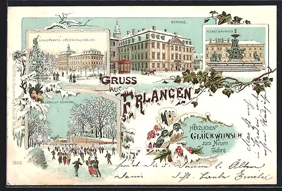 Winter-Lithographie Erlangen, Universitäts-Collegiengebäude, Rathaus, Kunstbrunnen, Neujahrsgruss