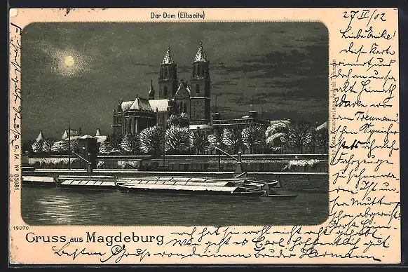 Winter-Lithographie Magdeburg, Der Dom, Elbseite