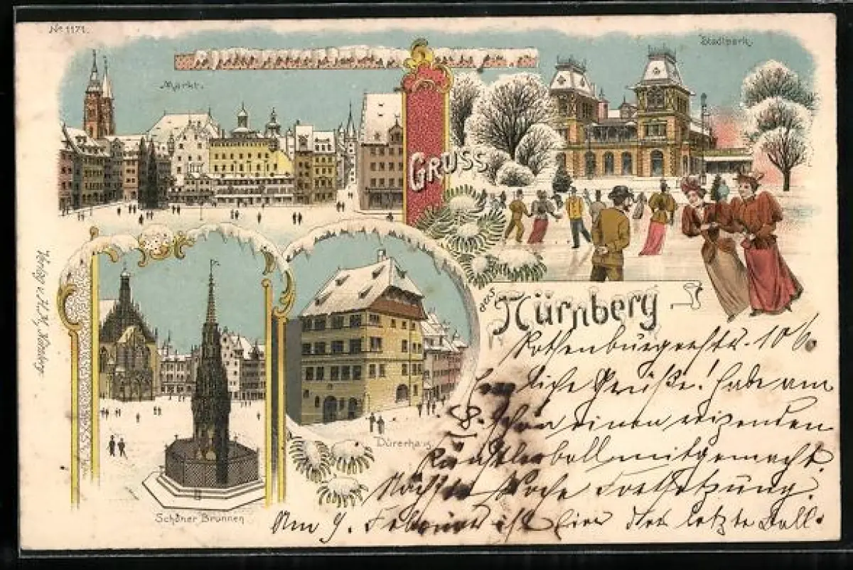 Winter-Lithographie Nürnberg, Schöner Brunnen, Dürerhaus, Schlittschuhläufer im Stadtpark
