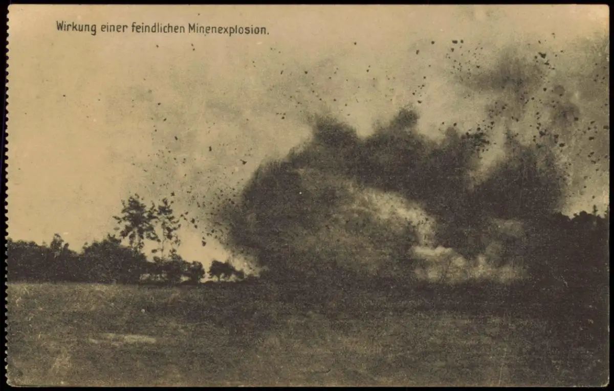 Wirkung einer feindlichen Minenexplosion. Militär/Propaganda 1.WK 1918