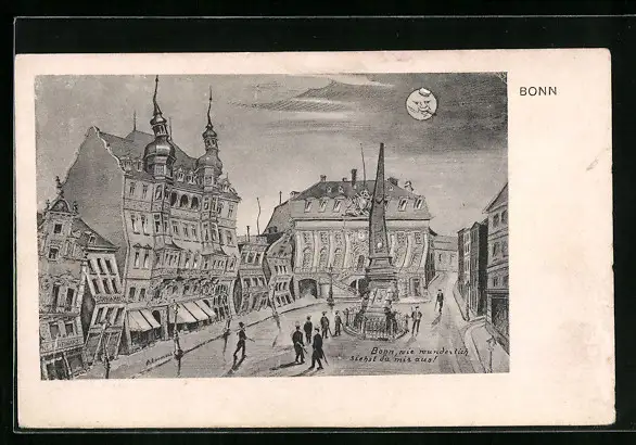 Wirtshaus-AK Bonn, Strassenpartie mit Denkmal bei Mondschein aus der Sicht eines Betrunkenen