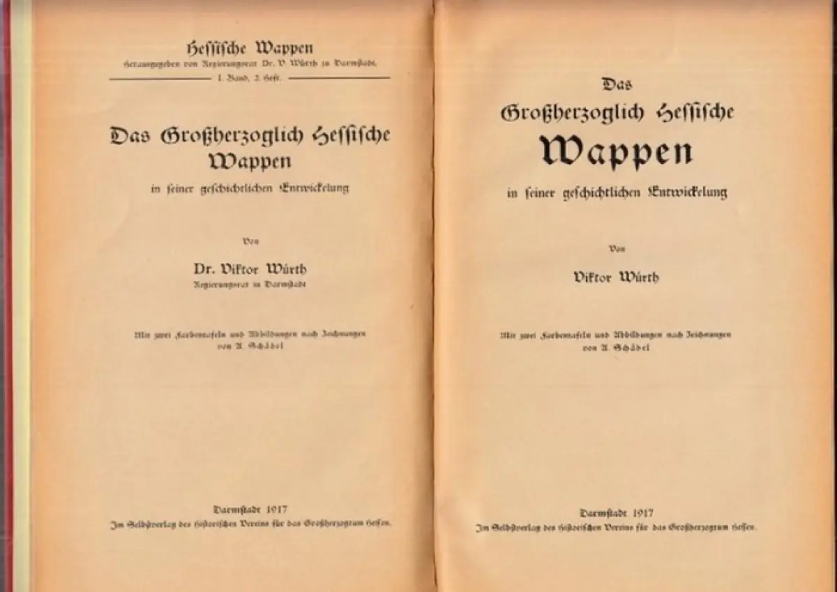 Titel: Das Großherzoglich Hessische Wappen in seiner geschichtlichen Entwickelung ( Entwicklung ). (= Hessische Wappen, I. Band, 2. Heft) Gliederung: Einleitung / Das Wappen der Landgrafschaft Hessen vor der Teilung / Das Wappen der Landgrafschaft Hessen-Darmstadt / Das Großherzogliche Wappen / Stammtafel / Orts- Personen u. Sachregister