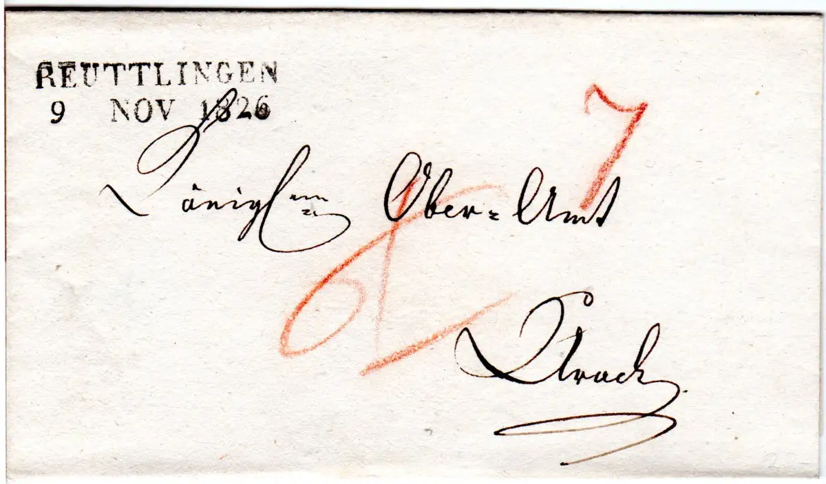 Württemberg 1826, L2 REUTTLINGEN auf sehr schönem Porto Brief n. Urach
