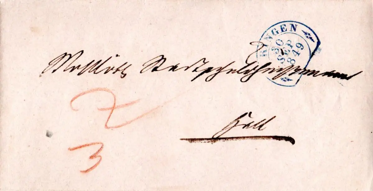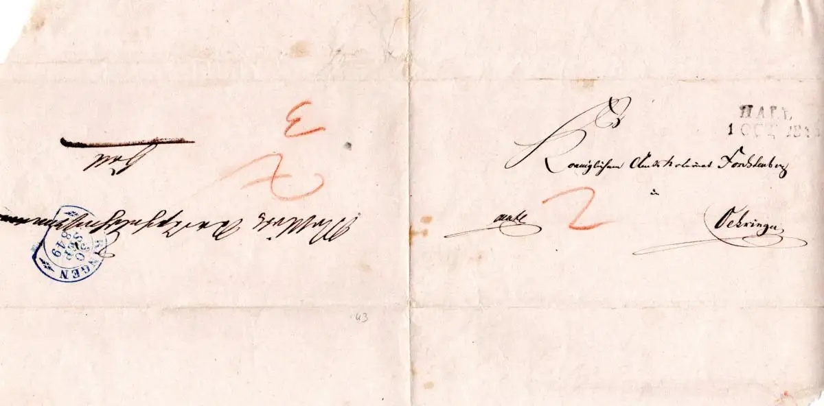Württemberg 1849, blauer Steigbügelstpl. OERINGEN auf 2x verw. Brief nach Hall