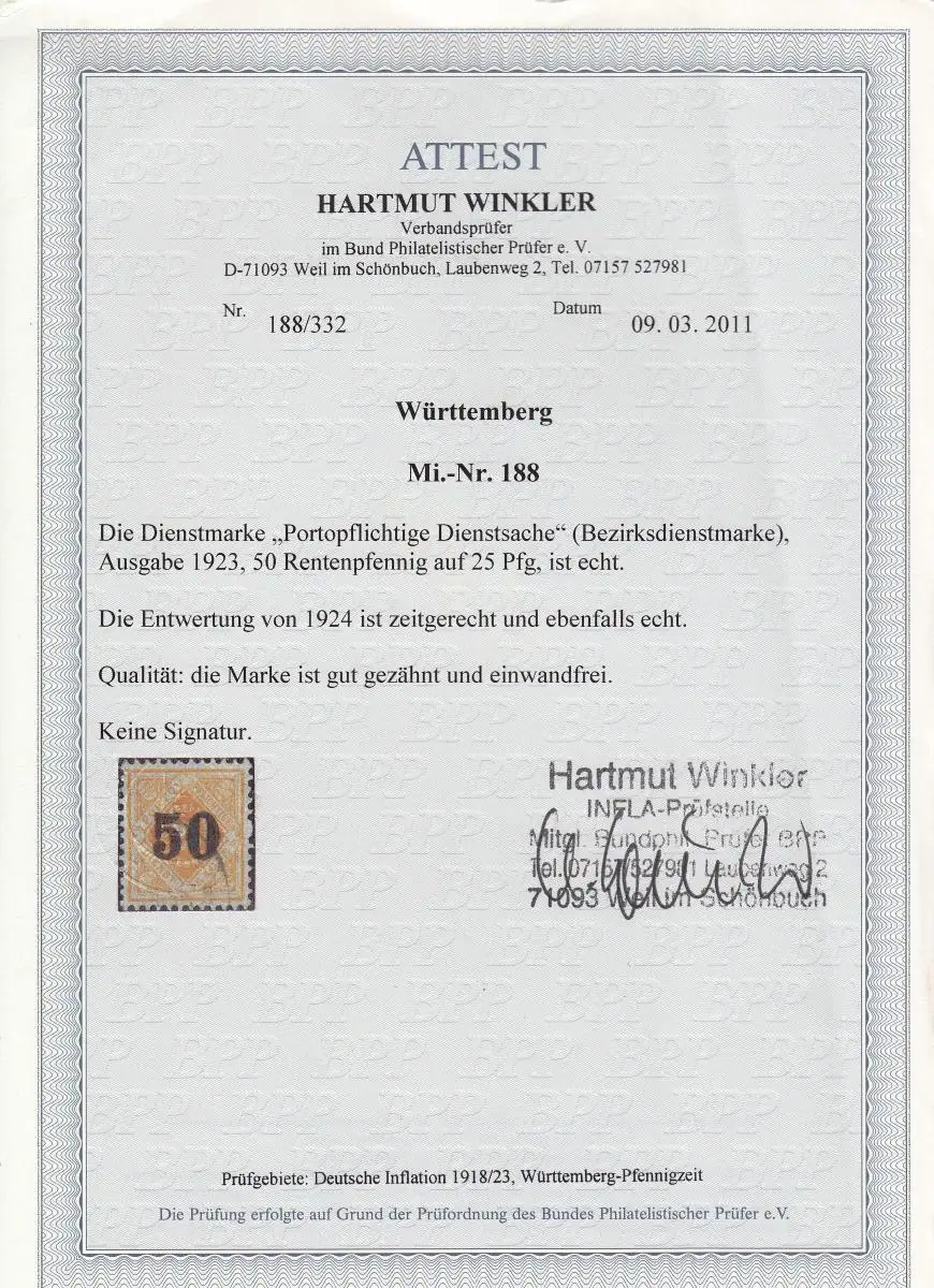 Württemberg: Dienst MiNr. 188, gestempelt 1924, BPP Attest