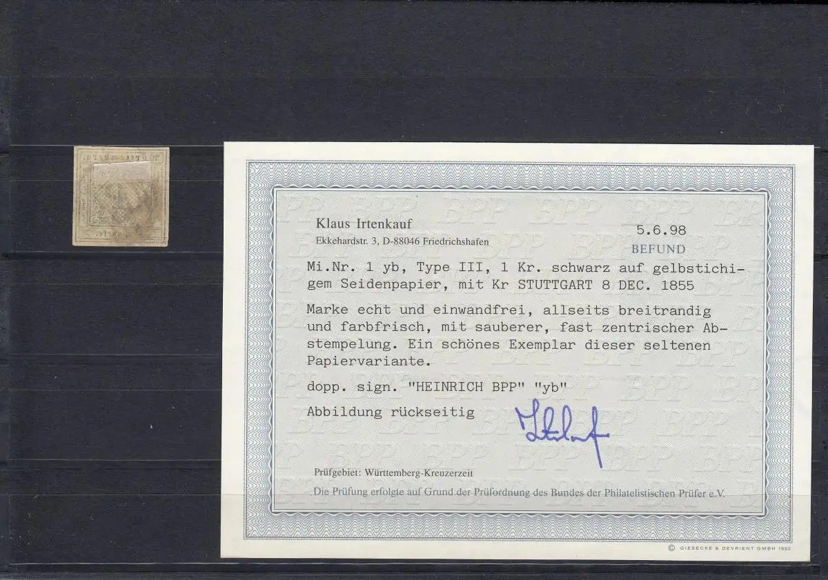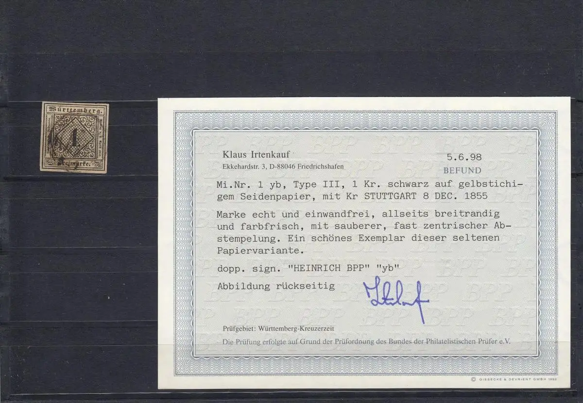 Württemberg: MiNr. 1 yb, gestempelt Stuttgart, BPP Befund