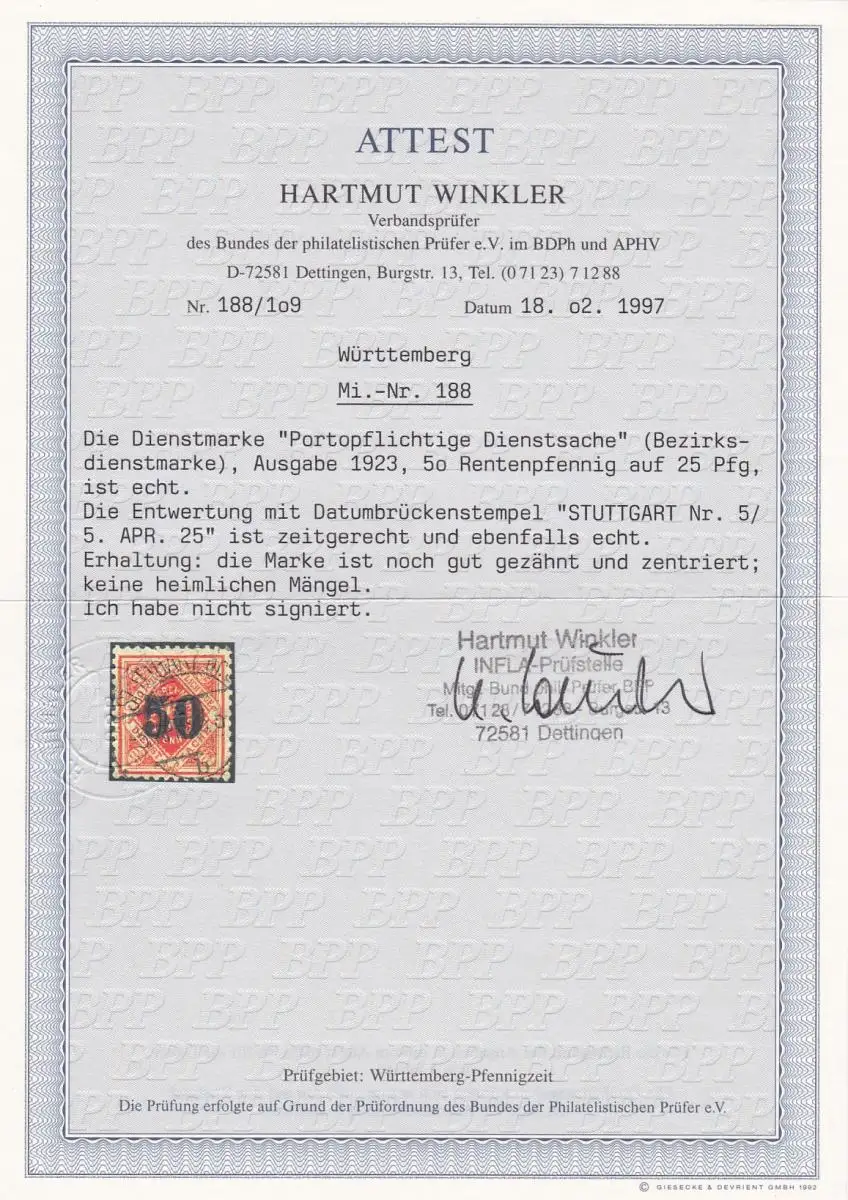 Württemberg: MiNr. 188: Dienst, gestempelt, BPP Attest