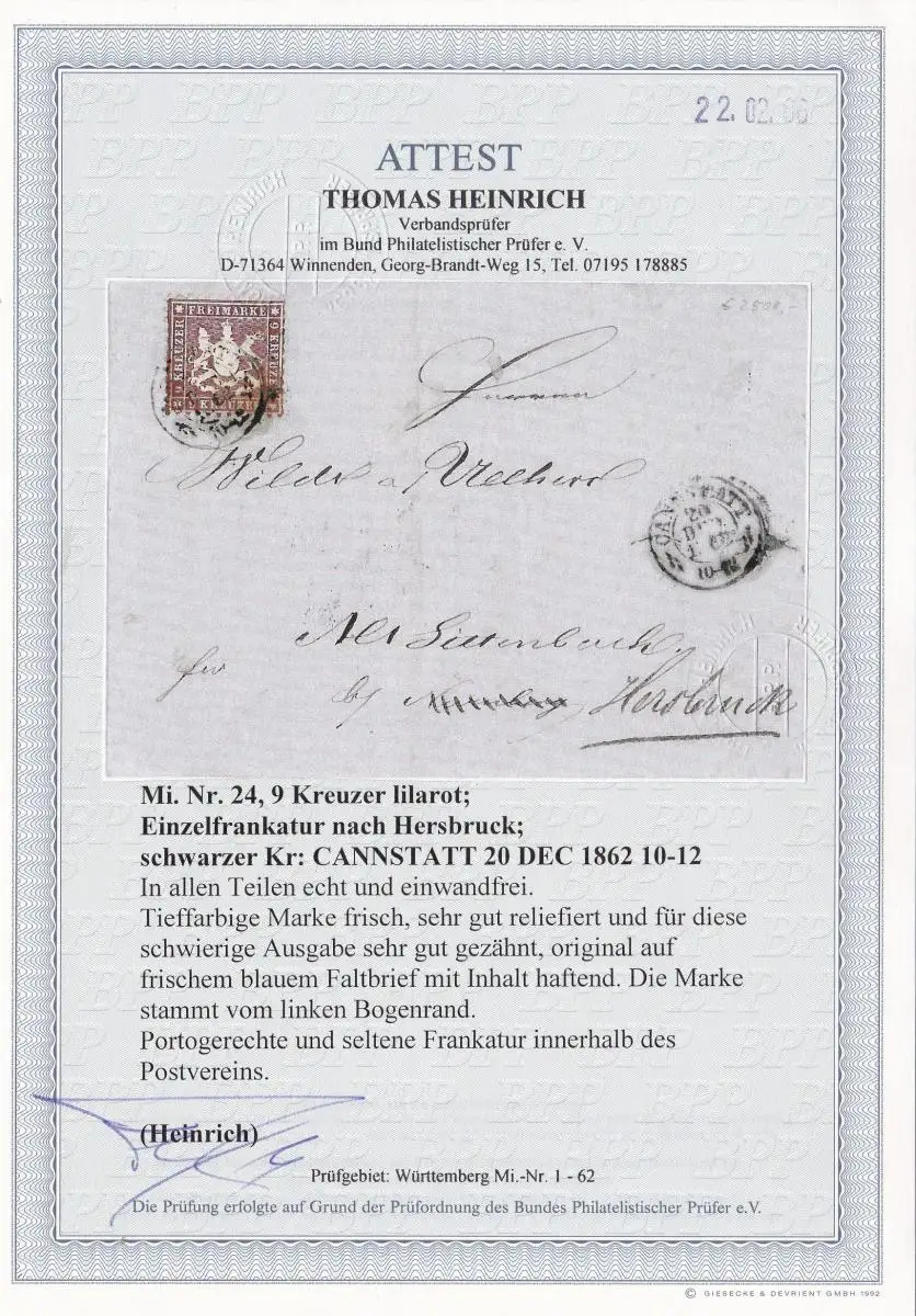 Württemberg: MiNr. 24 - Einzelfrankatur: BPP Attest