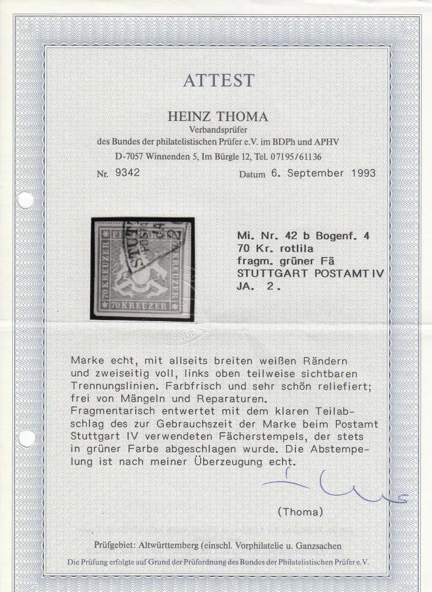 Württemberg: MiNr. 42b, Bogenfeld 4, gestempelt Stuttgart, BPP Attest