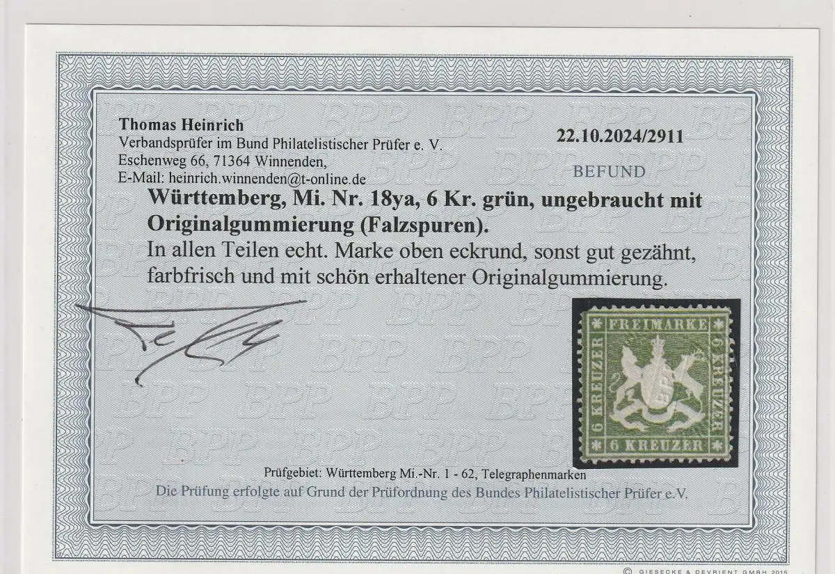Württemberg: Nr. 18y a, ungebraucht, Befund Heinrich BPP