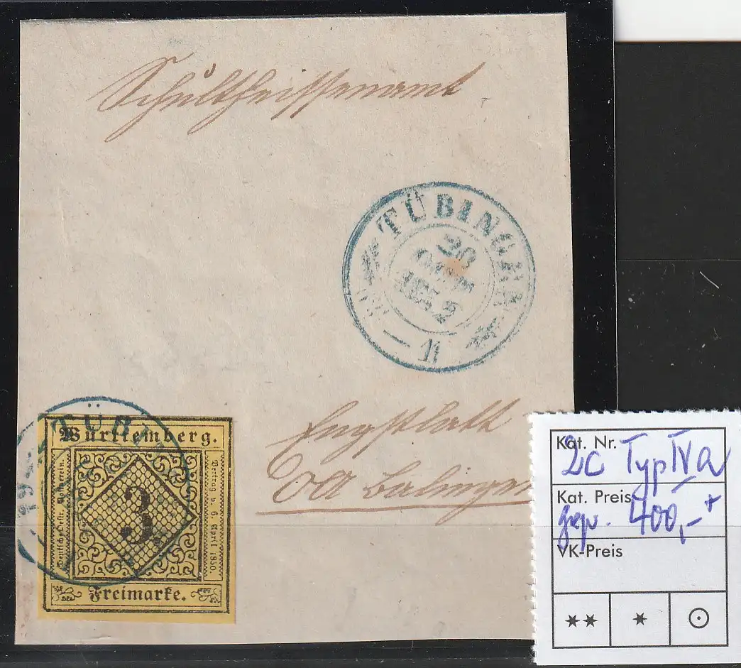 Die Marke ist einwandfrei erhalten, s. Abbildung. Großes Briefstück, sauberer Stempel Tübingen in blau. Tiefst-doppelt-geprüft Thoma BPP. Michelwert 400,00 €+