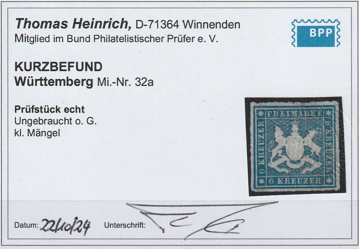 Württemberg: Nr. 32 a, ungebraucht, Kurzbefund Heinrich BPP