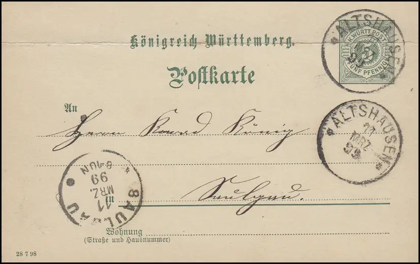 Württemberg P 37 Ziffer 5 Pf. DV 28 7 98 von ALTSHAUSEN 11.3.99 nach SAULGAU