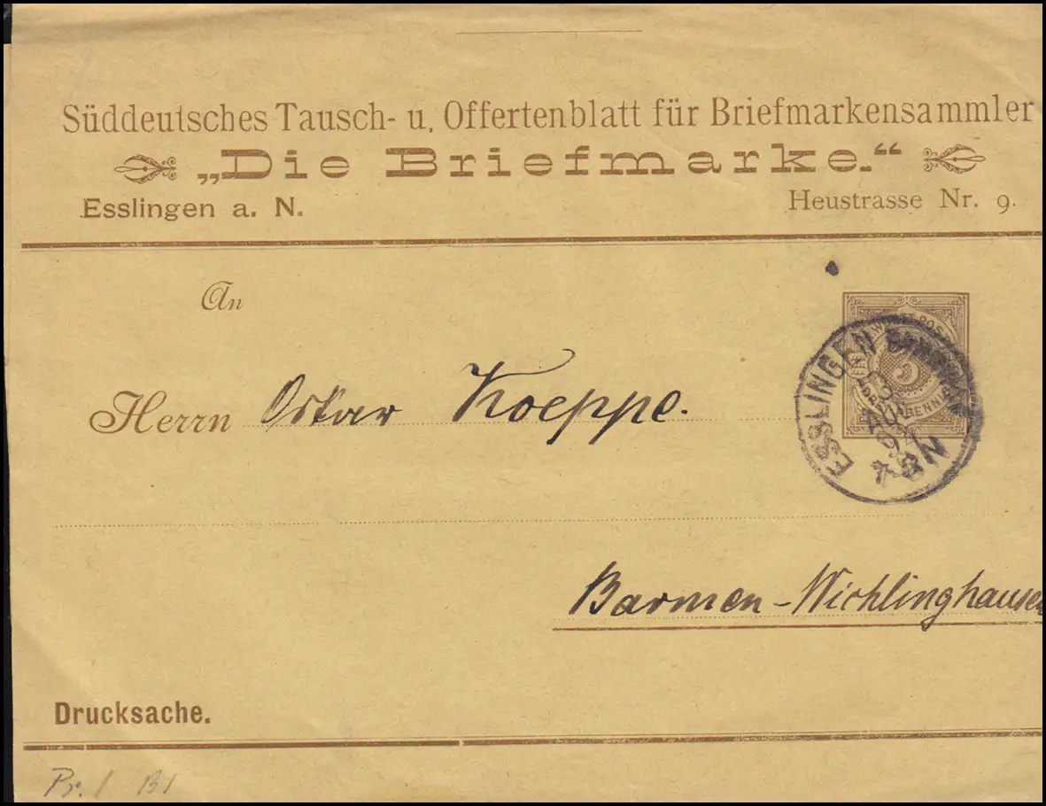 nach Barmen-Wichlinghausen 15.8.94, Absender: Süddeutsches Tausch- und Offertenblatt für Briefmarkensammler DIE BRIEFMARKE Esslingen