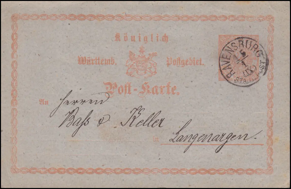 Württemberg Postkarte P 9/01 Ziffer 2 Kr. RAVENSBURG STADT-POST 15.1.(IX) 1874