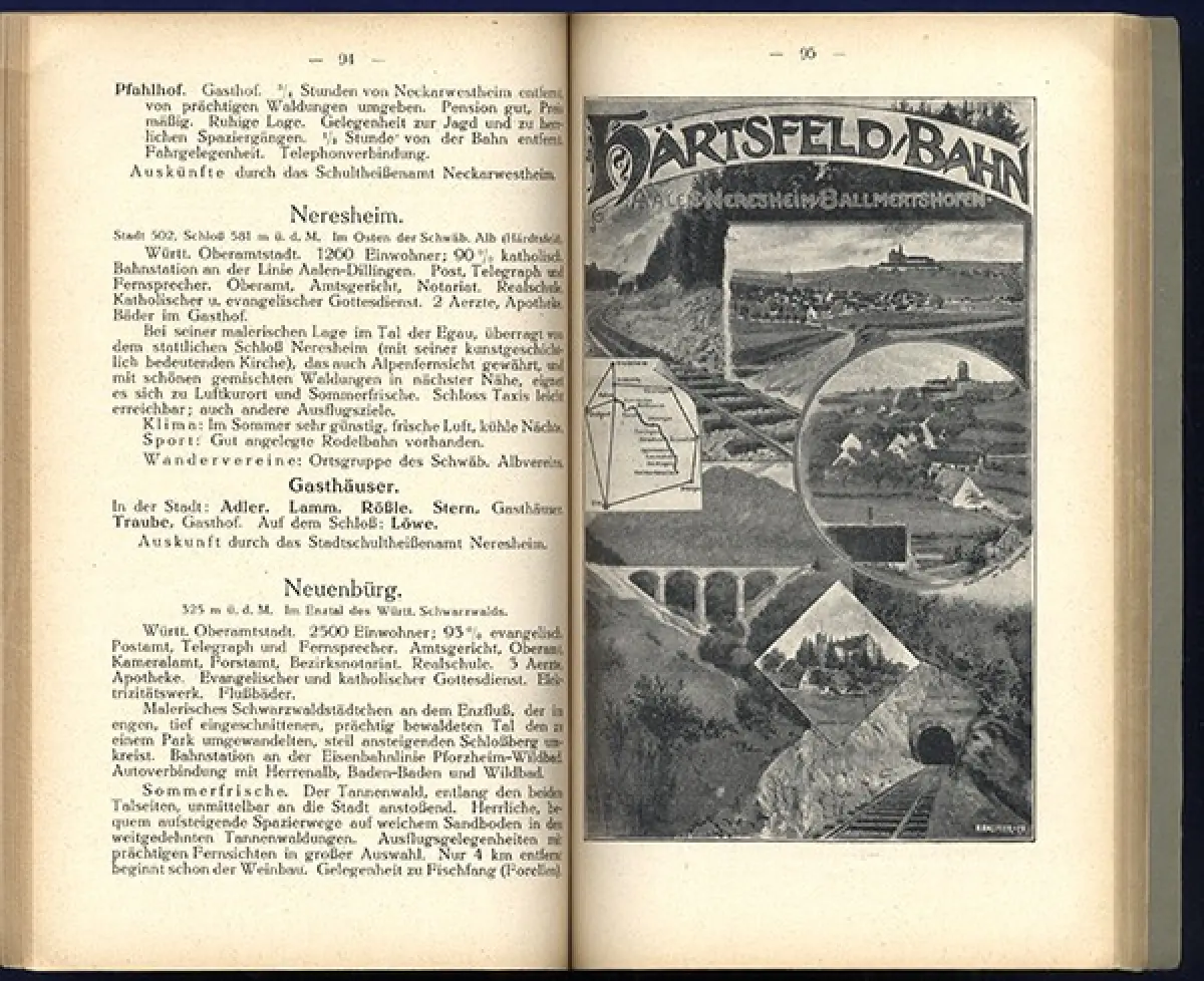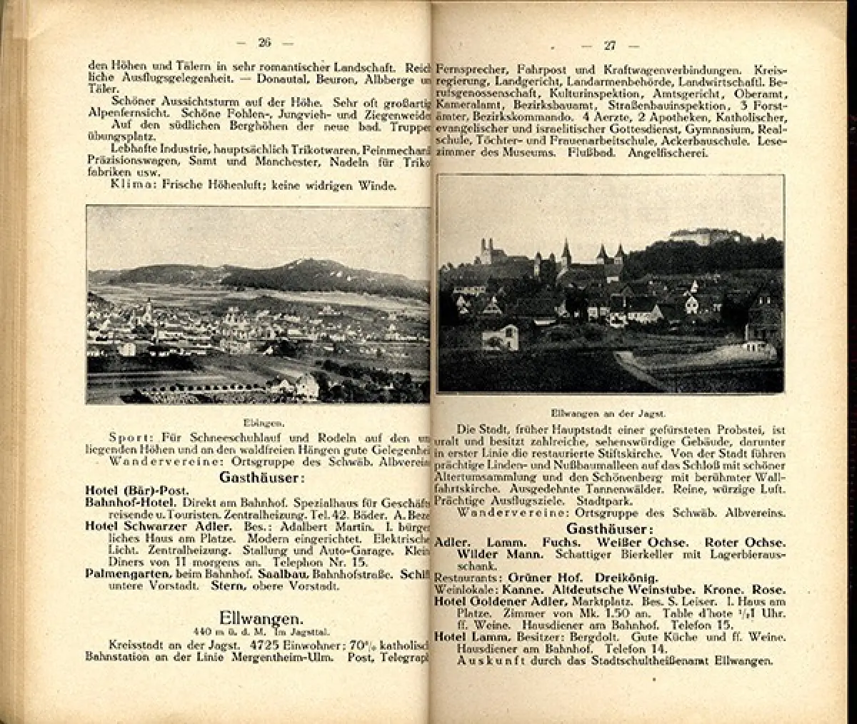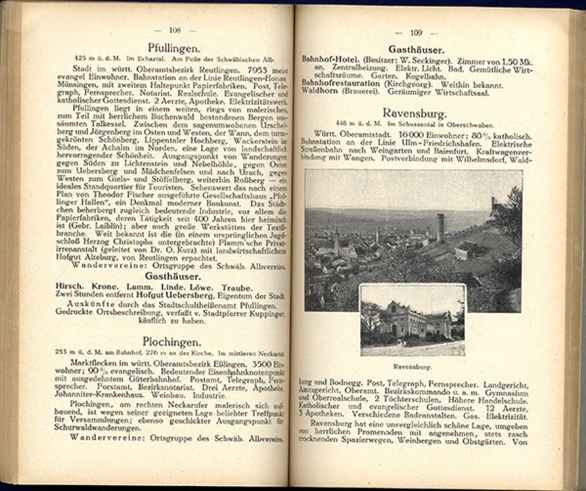 mit GESAMT 230 Seiten fotografischenund druckgraphischen Abbildungen die schwäbische Landscahft ihre Gestalt und ihr Klima Temperaturen und Mineralquellen Wintersportmöglichkeiten in Schaben und Hohenzollern Verzeichnis der im Buch genannten Orte Kurorte und Sportplätze was folgt ist eine Kurzbeschreibug von ca 300 Ortschaften Döfern Bädern und Kurorten oft Angabe der Gasthäuser und Übernachtungsmöglichkeiten und Einkehr in Gaststätten und Hotelbetrieben dazu auch entprechende Anzeigen und Inserate