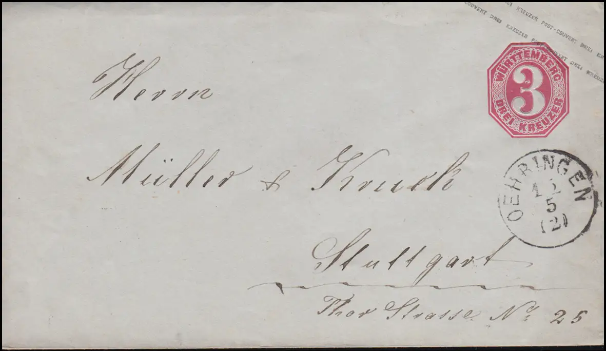 Württemberg Umschlag U 20 von OEHRINGEN 15.5. nach STUTTGART Einkreis D1 - 16.5.